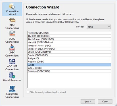 In the Connection Wizard pane (see screenshot below) databases can be sorted alphabetically by the name of the database type or by recent usage. Select the option you want in the Sort By combo box. After you have selected the database type to which you want to connect, click Next.