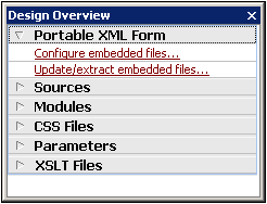 Clicking the Configure Embedded Files link in Design Overview (see screenshot above) opens the Configure Portable XML Form (PXF) dialog. The configuration options are exactly the same as described in the section, Creating a PXF File.