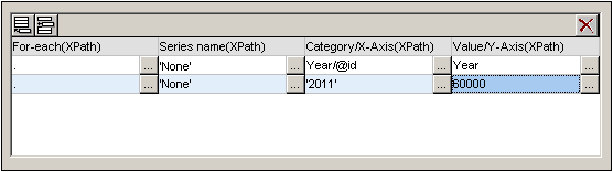 4.The X-Axis selects the labels to be used for the slices of the pie chart, in this case the years 2005 to 2010, which are obtained with the XPath expression Year/@id (see screenshot below).