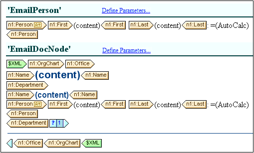 The screenshot above shows two Design Fragment templates that produce identical output for the Person element. In the EmailPerson Design Fragment template, the Person node has been created by dragging the global element Person into the EmailPerson template. In the EmailDocNode Design Fragment template, the Person node has been dragged from the Root Elements tree, and is created with an absolute path (from $XML, the document node).