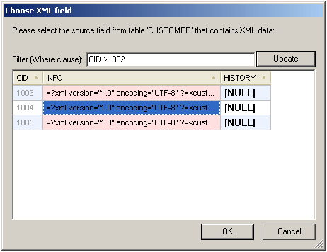 You can enter a filter for this table. The filter should be an SQL WHERE clause (just the condition, without the WHERE keyword, for example: CID>1002). Click Update to refresh the dialog. In the screenshot above, you can see the result of a filtered view. Next, select the cell containing the required XML document and click OK. The XML document in the selected cell (row) is loaded into Authentic View.
