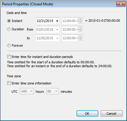 The dialog enables you to specify an Instant, Duration, or Forever value of the Period. Select the Period property you want to define (Instant, Duration, or Forever) by clicking its radio button. To enter a time value for an Instant or Duration, check the Enter time check box. Then select or enter the date (and time). Enter timezone information if this is required. Click OK when done. The Period elements that match the property defined in this dialog will be returned.