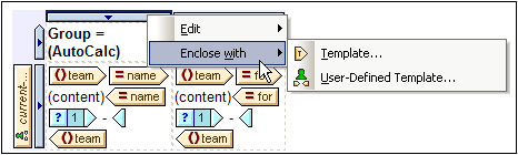 A row or column can be enclosed with a template by right-clicking the row or column indicator and, from the context menu that pops up (screenshot below), selecting Enclose With | Template or Enclose With | User-Defined Template. In the next step, you can select a node from the schema tree or enter an XPath expression for a User-Defined Template. A template will be created around the row or column.