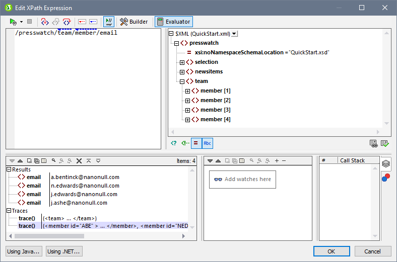 Tracepoints are points at which the results are recorded. These results are displayed in the Traces tree of the Result tab (see screenshot below). This enables you to see all the evaluation results of particular parts of the expression. For example, in the screenshot below, tracepoints have been set on the team node and member node. The results at these tracepoints are shown in the Traces tree.