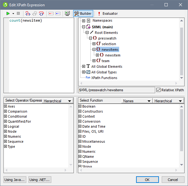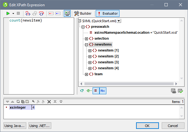 5.In the schema tree, note that the context node is newsitems, which is highlighted. Now, in the Expression text box either type in the expression count(newsitem) or build the expression using the entry-helper panes below the Expression text box. (Double-click the count function (found in the Sequence group of functions) to enter it, then (in the expression in the text box) place the cursor within the parentheses of the function and double-click the newsitem node in the schema tree. You can see what the XPath expression returns by clicking the Evaluator button. The result of the evaluation will be in the Results pane (see screenshot below). For a detailed description of the Edit XPath Expression dialog, see the section Edit XPath Expression.