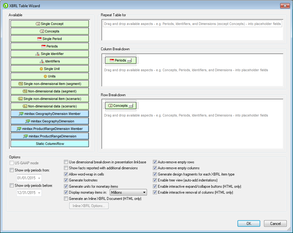 •XBRL Table Options explains the various options that can be specified for the XBRL table.