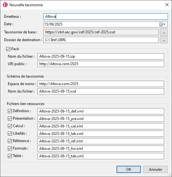 Un pack de taxonomie XBRL est une archive compressée contenant le schéma du point d'entrée de la taxonomie, les fichiers de relation et d'autres informations sur la taxonomie, telles que les taxonomies importées et les remappages. Si vous souhaitez créer la nouvelle taxonomie sous forme de pack de taxonomie, cochez cette case et finalisez le nom du fichier du pack et son URI public. Si vous choisissez de créer un pack de taxonomie, tous les fichiers de taxonomie seront stockés dans le pack, et non sous forme de fichiers dans le dossier. À l'inverse, si vous choisissez de ne pas créer de pack de taxonomie, les fichiers de taxonomie seront créés directement dans le dossier.
