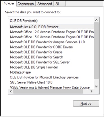 Si un fournisseur OLE DB de votre base de données n'est pas disponible, veuillez installer le pilote requis depuis le distributeur de base de données (voir Aperçu des pilotes de base de données ). En alternative, vous pouvez établir une connexion ADO.NET, ODBC ou JDBC.