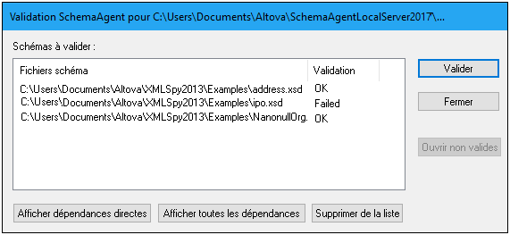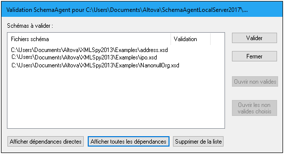 XMLSpy, utilisé de concert avec SchemaAgent, vous permet de valider non seulement le schéma actif actuel mais également les schémas liés au schéma actif actuellement. Nous appelons cela une validation de SchemaAgent. SchemaAgent fait la distinction entre deux types de schéma pour une validation étendue : (i) des schémas directement dépendants (des schémas référencés directement et des schémas de référencement directs), et (ii) tous les schémas dépendants (outre les dépendances directes, celles-ci comprennent des dépendances indirectes, il s'agit là du jeu de schémas liés l'un à l'autre par le biais d'un schéma intermédiaire.