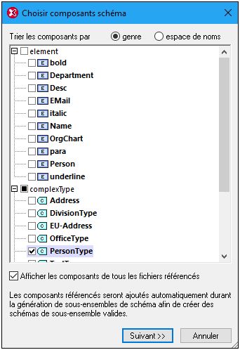 1.Le Schéma XML requis étant actif dans le Mode Schéma, sélectionner la commande Conception de Schéma | Créer sous-ensemble de schéma. Le dialogue Choisir les composants de schéma s'ouvre (capture d'écran ci-dessous).
