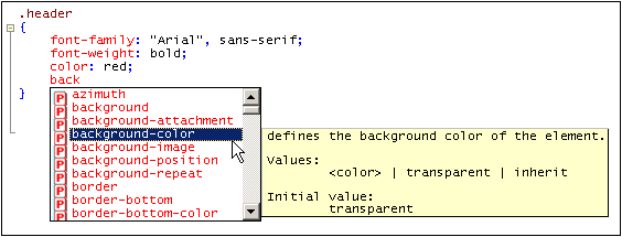 Vous pouvez consulter une info-bulle contenant une définition d'une propriété et ses valeurs possibles en faisant défiler la liste ou en parcourant la liste avec les touches fléchées Haut et bas de votre clavier. L'info-bulle de la propriété marquée s'affiche. Pour insérer une propriété, appuyez soit Entrer lorsqu'elle est sélectionnée, soit cliquer dessus.
