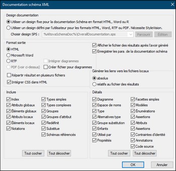 Si un schéma JSON est le document actif, vous pouvez générer une documentation en cliquant sur la commande Conception de Schéma | Générer une Documentation. Vous pouvez générer la documentation en format HTML, MS Word, ou RTF et spécifier les composants que vous souhaitez inclure. Les composants JSON liés sont reliés par hyperliens dans la documentation générée, permettant une navigation simple.