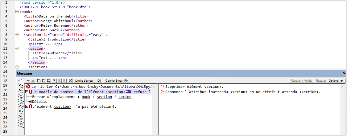 Les indicateurs d'erreur de validation et les smart fixes décrits ci-dessus sont réinitialisés uniquement lorsque la commande XML | Valider (F8) est exécutée ; ils ne sont pas mis à jour en arrière-plan. Donc, si vous corrigez une erreur, vous devrez exécuter la commande Valider (F8) à nouveau pour vous assurer que l'erreur a bien été réparée.