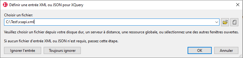 2.Choisir XSL/XQuery | XQuery/ Update Execution ou cliquer sur l'icône de barre d'outils de la commande. Le dialogue Définir une Entrée XML ou JSON pour le dialogue XQuery (capture d'écran ci-dessous).