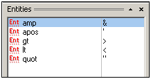 Une entité contenue dans le Authentic View est généralement une donnée XML (mais pas nécessairement), comme un caractère unique ; une chaîne de texte ; et même un fragment de document XML. Une entité peut aussi être un fichier binaire, comme un fichier d'image. Toutes les entités disponibles pour un document particulier sont affichées dans l'assistant à la saisie Entités (capture d'écran ci-dessous). Pour insérer une entité, placer le curseur à l'endroit du document où vous souhaitez l'insérer puis double-cliquer sur l'entité dans l'assistant à la saisie Entités. Veuillez noter que vous ne pouvez pas saisir des entités dans l'assistant à la saisie Entités.