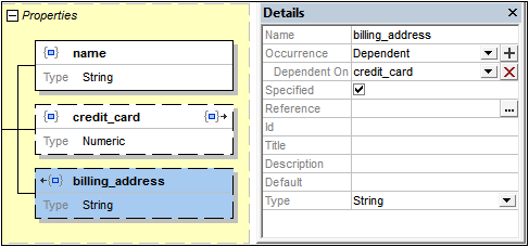 Dans le cadre de la définition d'un objet, vous avez la possibilité de spécifier qu'une certaine propriété doit être présente uniquement si une autre propriété est présente. La première propriété est dite dépendante de la deuxième propriété. Voici un scénario contenant une dépendance. Un objet (nommé par exemple member) a une propriété appelée credit_card, qui est définie en tant qu'optionnelle. La propriété de l'objet billing_address peut être rendue dépendante de la propriété credit_card : ce n'est que si la propriété credit_card est présente que la propriété billing_address sera présente.