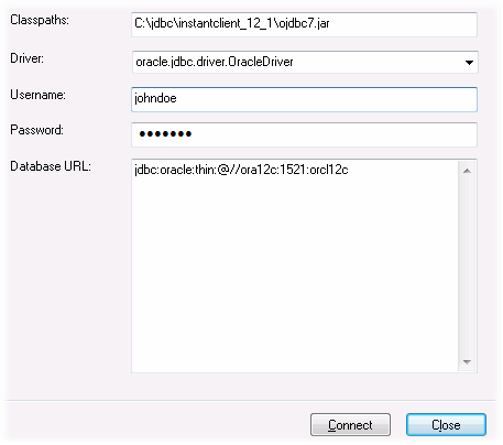 3.À côté de « Classpaths », saisissez le chemin menant au fichier .jar qui fournit une connectivité à la base de données. Si nécessaire, vous pouvez aussi saisir une liste séparée par points-virgules de chemins d'accès de fichiers .jar. Dans cet exemple, le fichier .jar exigé se trouve sous le chemin suivant : C:\jdbc\instantclient_12_1\ojdbc7.jar. Veuillez noter que vous pouvez laisser en blanc le champ « Chemins de classe » si vous avez ajouté le(s) chemin(s) d'accès du fichier .jar à la variable d'environnement CLASSPATH du système d'exploitation (voir aussi Configuration du CLASSPATH).