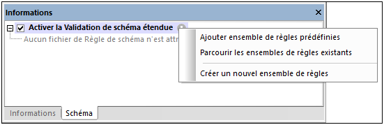 Un ou plusieurs fichiers d'Ensemble de règles de schéma (fichiers .xml) peut être attribué au Schéma XML actif (fichier .xsd). Cela s'effectue par le biais de l'onglet Schéma de la fenêtre Info (capture d'écran ci-dessous).