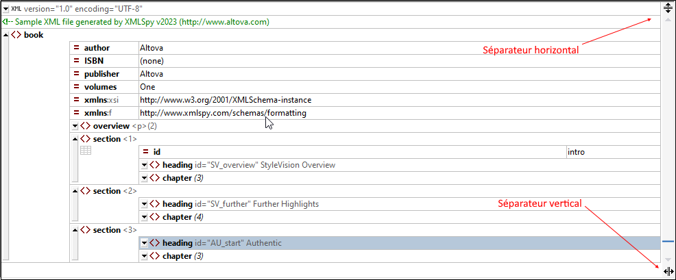 Le Mode écran divisé divise la fenêtre principale du Mode Grille (pour les documents XML; JSON et DTD) en soit deux parties verticale ou horizontale et affiche le document actif dans les deux parties. Ceci signifie essentiellement que vous aurez deux aperçus du document actif. Vous pouvez parcourir séparément chaque aperçu - ce qui vous permet de voir les différentes parties du document côte-à-côte. Si vous effectuez une modification dans chaque aperçu, alors elle sera appliquée dans le document sous-jacent et sera donc visible immédiatement dans les deux modes.