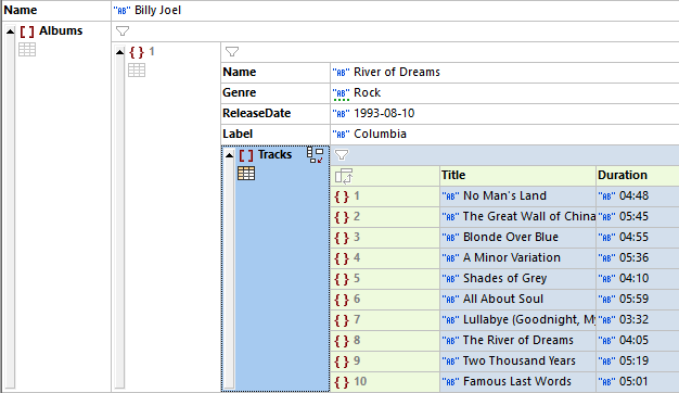 Les objets et arrays qui contiennent au moins un objet ou array peuvent être affichés soit comme liste (mis en surbrillance dans la capture d’écran à gauche) ou comme table (mis en surbrillance dans la capture d’écran à droite). Pour basculer entre ces deux modes, cliquez sur l’icône de la table qui est située en dessous de l’icône de l’objet ou de l’array (voir la capture d’écran). Dans les tables d’array, les items d’array sont affichés en tant que lignes. Dans la capture d’écran en dessous à droite, l’array Tracks array est affiché en tant que table. L’array consiste en objets enfants, qui sont affichés en tant que lignes. Chaque propriété d’objet (Titre et Durée dans la capture d’écran ci-dessous) est affichée en tant que colonne, avec les noms des propriétés communes étant affichés comme en-têtes des colonnes. Pour basculer des lignes et colonnes, cliquez sur l’icône dans la cellule gauche du haut de la table.