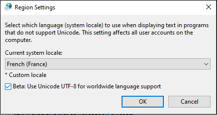 Trier l’ordre dans certaines langues, en particulier celles qui n’ont pas d’alphabet latin, peut être bénéfique en activant la prise en charge beta Unicode UTF-8 dans le dialogue des paramètres de la région linguistique de Windows 10 (ou supérieure). Pour ce faire, suivez les étapes suivantes : Allez au dialogue des Paramètres de Windows et recherchez les Paramètres de langue. Sous Paramètres associés, cliquez sur Paramètres de langue administrative. Dans le dialogue Région qui apparaît, allez à l’onglet Administrative et sous Language for non-Unicode programs, cliquez sur Change system locale. Dans le dialogue des paramètres de la région qui apparaît (voir la capture d’écran ci-dessous), sélectionnez l’option Beta : Use Unicode UTF-8 for worldwide language support et cliquez sur OK.