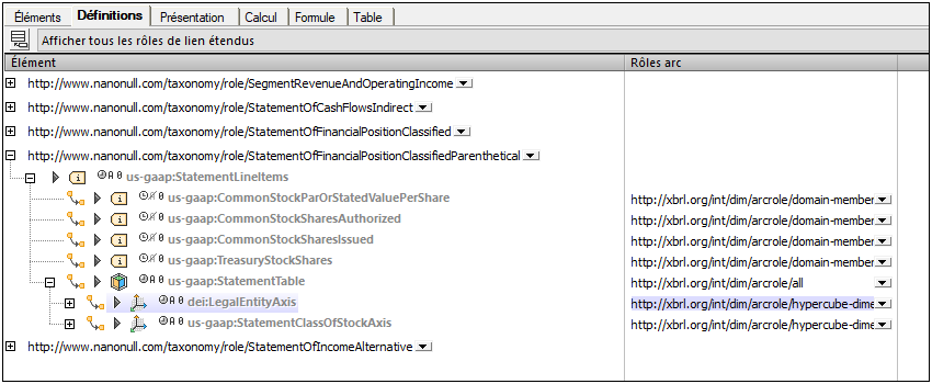 L'onglet Table propose un autre moyen de définir les affichages des concepts définies dans les taxonomies XBRL. Ces définitions sont contenues dans des bases de lien de table que vous pouvez créer et éditer dans l'onglet Table. Voir la section Éditeur de définitions de Table XBRL pour plus d'informations concernant l'édition des bases de lien de table.