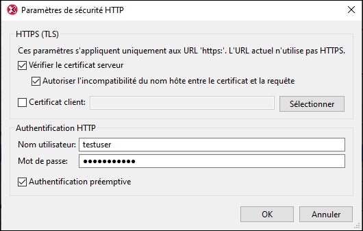 •Authentification HTTP : Certaines requêtes vers un serveur pourraient requérir une authentification de l’utilisateur. Dans ces cas, vous pouvez saisir ici un nom d'utilisateur et un mot de passe. Lorsque l'authentification est requise par le serveur, elle sera fournie automatiquement. Sinon, vous serez invité à la saisir une fois que la connexion au serveur est établie. Lorsque la requête initiale au serveur contient les informations d’authentification, ce processus est appelé une authentification préemptive. Si cela est exigé par le serveur, sélectionner l'option Authentification préemptive.