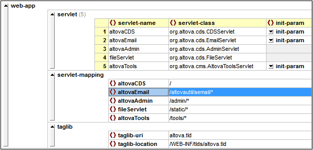 { "web-app": { "servlet": [ { "servlet-name": "altovaCDS", "servlet-class": "org.altova.cds.CDSServlet", "init-param": { "configGlossary:installationAt": "Philadelphia, PA", "configGlossary:adminEmail": "ksm@pobox.com", "configGlossary:poweredBy": "Altova", "configGlossary:poweredByIcon": "/images/altova.gif", "configGlossary:staticPath": "/content/static", "templateProcessorClass": "org.altova.WysiwygTemplate", "templateLoaderClass": "org.altova.FilesTemplateLoader", "templatePath": "templates", "templateOverridePath": "", "defaultListTemplate": "listTemplate.htm", "defaultFileTemplate": "articleTemplate.htm", "useJSP": false, "jspListTemplate": "listTemplate.jsp", "jspFileTemplate": "articleTemplate.jsp", "cachePackageTagsTrack": 200, "cachePackageTagsStore": 200, "cachePackageTagsRefresh": 60, "cacheTemplatesTrack": 100, "cacheTemplatesStore": 50, "cacheTemplatesRefresh": 15, "cachePagesTrack": 200, "cachePagesStore": 100, "cachePagesRefresh": 10, "cachePagesDirtyRead": 10, "searchEngineListTemplate": "forSearchEnginesList.htm", "searchEngineFileTemplate": "forSearchEngines.htm", "searchEngineRobotsDb": "WEB-INF/robots.db", "useDataStore": true, "dataStoreClass": "org.altova.SqlDataStore", "redirectionClass": "org.altova.SqlRedirection", "dataStoreName": "altova", "dataStoreDriver": "com.microsoft.jdbc.sqlserver.SQLServerDriver", "dataStoreUrl": "jdbc:microsoft:sqlserver://LOCALHOST:1433;DatabaseName=goon", "dataStoreUser": "sa", "dataStorePassword": "dataStoreTestQuery", "dataStoreTestQuery": "SET NOCOUNT ON;select test='test';", "dataStoreLogFile": "/usr/local/tomcat/logs/datastore.log", "dataStoreInitConns": 10, "dataStoreMaxConns": 100, "dataStoreConnUsageLimit": 100, "dataStoreLogLevel": "debug", "maxUrlLength": 500 } }, { "servlet-name": "altovaEmail", "servlet-class": "org.altova.cds.EmailServlet", "init-param": { "mailHost": "mail1" "mailHostOverride": "mail2" } }, { "servlet-name": "altovaAdmin", "servlet-class": "org.altova.cds.AdminServlet" }, { "servlet-name": "fileServlet", "servlet-class": "org.altova.cds.FileServlet" }, { "servlet-name": "altovaTools", "servlet-class": "org.altova.cms.AltovaToolsServlet", "init-param": { "templatePath": "toolstemplates/", "log": 1, "logLocation": "/usr/local/tomcat/logs/AltovaTools.log", "logMaxSize": "", "dataLog": 1, "dataLogLocation": "/usr/local/tomcat/logs/dataLog.log", "dataLogMaxSize": "", "removePageCache": "/content/admin/remove?cache=pages&id=", "removeTemplateCache": "/content/admin/remove?cache=templates&id=", "fileTransferFolder": "/usr/local/tomcat/webapps/content/fileTransferFolder", "lookInContext": 1, "adminGroupID": 4, "betaServer": true } } ], "servlet-mapping": { "altovaCDS": "/", "altovaEmail": "/altovautil/aemail/*", "altovaAdmin": "/admin/*", "fileServlet": "/static/*", "altovaTools": "/tools/*" }, "taglib": { "taglib-uri": "altova.tld", "taglib-location": "/WEB-INF/tlds/altova.tld" } } }