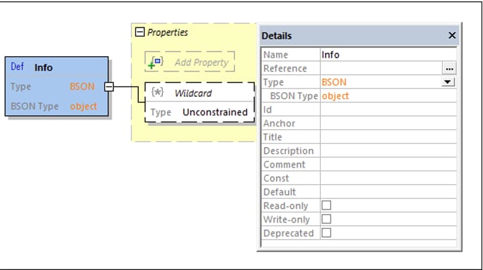 Lors de l’addition de nouvelles données DB et de la modification de données DB, MongoDB permet aux données DB d’être validées par rapport au document de schéma JSON. Toutefois, en raison des types de données BSON supplémentaires, qui ne font pas partie des spécifications de schéma JSON officielles mais les complémentent, les schémas JSON pour BSON sont édités dans XMLSpy via une couche d’édition pour BSON qui est superposée sur l’éditeur de schéma JSON. Cette couche d’édition vous permet d’ajouter et de modifier des fonctions de schéma spécifiques à BSON - en plus de l’addition aux fonctions JSON standard.