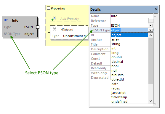 2.Une fois le type de base du composant sélectionné en tant que BSON, les types BSON deviennent disponibles pour la sélection. Sélectionnez le type BSON soit dans la sélection du type de données du composant (touche de direction vers la gauche dans la capture d’écran ci-dessous) ou dans l’assistant d’entrée Détails (touche de direction à droite dans la capture d’écran ci-dessous).