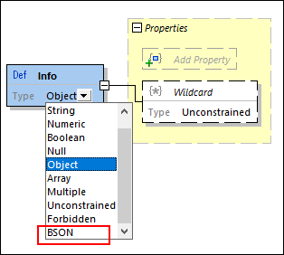 Après avoir activé la couche d’édition BSON, les types de données BSON deviennent disponibles pour les objets JSON, propriétés et items d’array. Spécifier qu’un composant est un type BSON consiste en deux étapes à suivre :