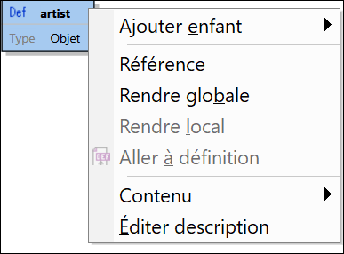 •Le menu contextuel de la définition (accédé en cliquant avec la touche de droite sur la fenêtre de la définition dans la fenêtre principale)