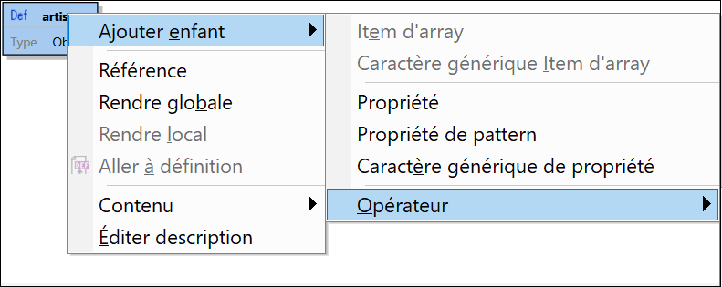 Le menu contextuel d'une définition (fenêtre bleue dans la capture d'écran ci-dessous) vous permet de concevoir la structure de la définition et d'éditer ses propriétés.