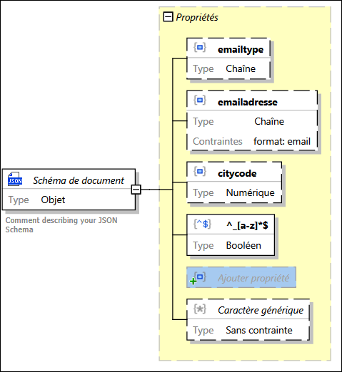 Un caractère générique de propriété (capture d'écran ci-dessous) spécifie que tout nombre de propriétés peut se produire en plus des autres propriétés du set de propriétés de l'objet. Néanmoins, le caractère générique peut définir un type pour ces occurrences. La capture d'écran ci-dessous à gauche montre un caractère générique de propriété qui définit des propriétés avec n'importe quel nom mais possédant des valeurs numériques. Il ne peut y avoir qu'un caractère générique de propriété par objet. Si le caractère générique est défini sur le type Tout, néanmoins, vous pourrez définir des contraintes pour chaque type dans l'assistant à la saisie Contraintes. Veuillez noter l'icône pour les caractères génériques de propriété.