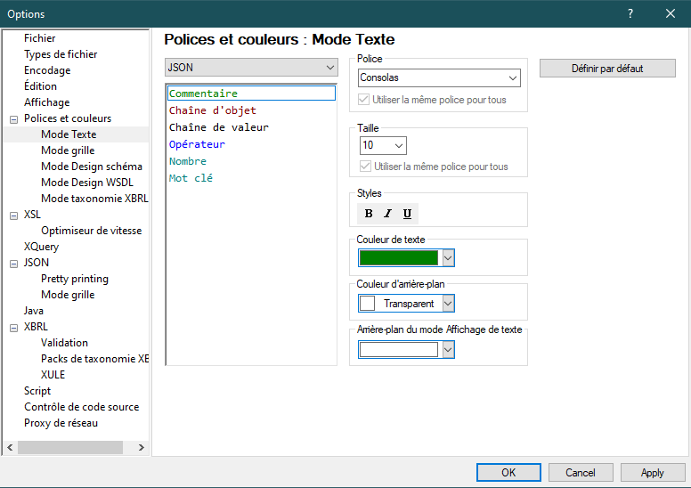 Un document JSON (instance/schéma JSON ou Avro) ainsi qu’un document JSON5 est constitué de chaînes d'objets, de chaînes de valeur, d'opérateurs, de numéros et de mots-clés. Dans le Mode Texte, chaque catégorie d'item peut être affichée dans une couleur différente (voir capture d'écran ci-dessus) conformément aux paramètres que vous définissez dans le dialogue Options (voir capture d'écran ci-dessous). Vous pouvez définir les couleurs des différents composants JSON dans la section Polices d'écriture du dialogue Options (voir capture d'écran ci-dessous). Dans la liste de choix en haut à gauche, sélectionner JSON, puis sélectionner la couleurs souhaitée (dans le panneau Styles) pour chaque item JSON.