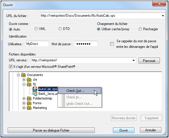 •Lorsqu'un fichier est récupéré par un autre utilisateur, il n'est plus disponible pour une récupération. •Lorsqu'un fichier est récupéré localement par vous, vous pouvez annuler la récupération avec la commande Undo Check-Out (Annuler récupération) dans le menu contextuel. En conséquence, le fichier sera retourné sans aucun changement sur le serveur. •Si vous procédez à une récupération d'un fichier dans une application Altova, vous ne pourrez pas faire de récupération dans une autre application Altova. Le fichier sera considéré comme s'il avait déjà été récupéré par vous. Les commandes disponibles à ce moment dans toute application Altova prenant en charge Microsoft® SharePoint® Server sera : Check In (archiver) et Undo Check Out (Annuler récupération).