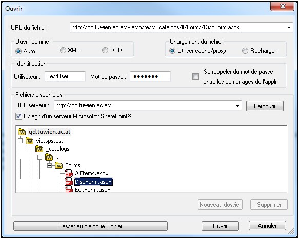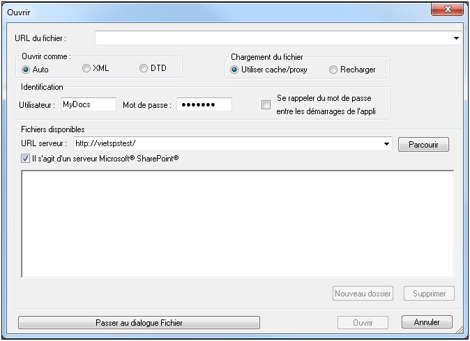 •La fonction Parcourir est uniquement disponible sur les serveurs qui prennent en charge WebDAV et sur les Microsoft SharePoint Servers. Les protocoles pris en charge sont FTP, HTTP et HTTPS. •Pour vous donner un plus grand contrôle du processus de chargement lors de l'ouverture d'un fichier, vous pouvez choisir de charger le fichier par le biais du cache local ou d'un serveur proxy (ce qui accélère considérablement le processus si le fichier a été chargé avant). En alternative, vous pouvez choisir de recharger le fichier si vous travaillez par exemple avec un système de publication électronique ou de base de données ; dans ce cas, choisir l'option Recharger. .