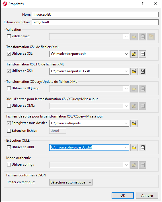 •Lorsque des validations ou des transformations XSLT/XQuery sont effectuées par le biais des menus contextuels du dossier de projet, la validation ou les fichiers de transformation spécifiés dans ce dialogue prévalent sur toute attribution dans le fichier XML. De même, les paramètres spécifiés pour les dossiers de projet individuels prévalent sur les paramètres définis pour les dossiers d'ancêtre.