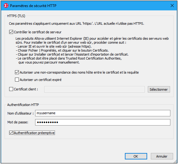 Si vous souhaitez permettre une non-correspondance du nom d'hôte (entre le nom d'hôte dans le certificat de serveur et l'adresse que vous utilisez réellement) ou un certificat de serveur expiré, alors cocher ces options dans le dialogue. Si le serveur nécessite un certificat client, vous pouvez spécifier l'emplacement du certificat de client. Si l'authentification est exigée par le serveur, spécifier le nom d'utilisateur et le mot de passe pour l'authentification standard. Lorsque la requête de client initiale vers le serveur contient les informations d'authentification requises, ce processus est qualifié d'authentification préemptive. Si exigé par le serveur, sélectionner l'option Authentification préemptive. Sinon, ne pas sélectionner l'option Authentification préemptive.