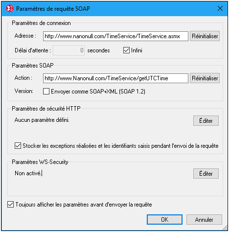 Cette commande affiche le dialogue de Paramètres de requête SOAP (capture d'écran ci-dessous), dans lequel vous pouvez spécifier des paramètres différents de la requête SOAP. Ces paramètres sont décrits ci-dessous.