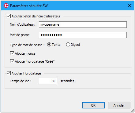 Certains services web exigent une authentification d'utilisateurs. (Le niveau de sécurité du service web se trouve en plus du niveau de sécurité HTTP mis en place par le serveur.) L'information d'authentification du service web est stocké dans la requête SOAP en tant qu'un fragment XML présentant une structure comme celle listée ci-dessous. Ce fragment XML est généré automatiquement dans la requête SOAP à partir de l'information d'authentification du service web que vous saisissez dans le dialogue Paramètres de sécurité SW.