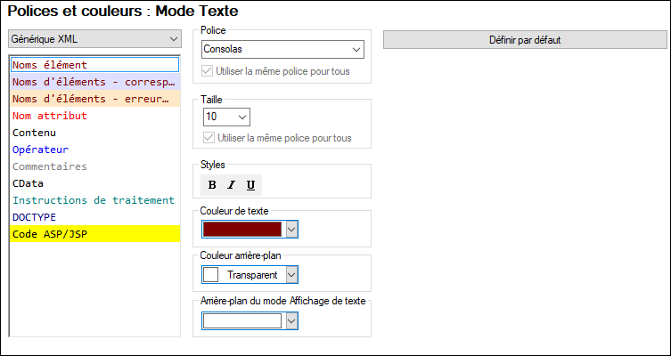 La section Polices et couleurs vous permet de personnaliser les options pour l'apparence des items de texte dans les différents modes de XMLSpy.