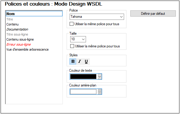 La section Mode Design WSDL vous propose des options de personnalisation pour l'apparence des items de texte dans le Mode WSDL (voir capture d'écran ci-dessous). Le formatage sera défini pour le thème actif actuel. Pour définir le formatage d’un autre thème, faites de l’autre thème le thème actif.