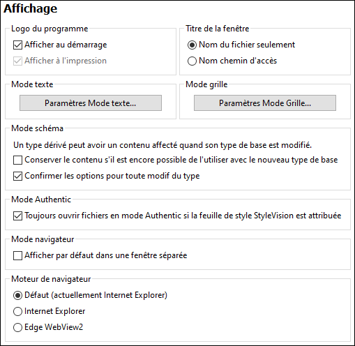 La section Mode vous permet de personnaliser la présentation des documents XML dans XMLSpy.