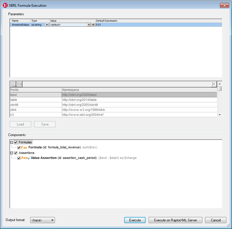 Si aucune formule ou assertion n'est définie dans le DTS, un message s'affichera. Si un formulaire valide ou une assertion est définie dans le DTS, le dialogue d'Exécution de la formule XBRL (capture d'écran ci-dessous) s'ouvre.