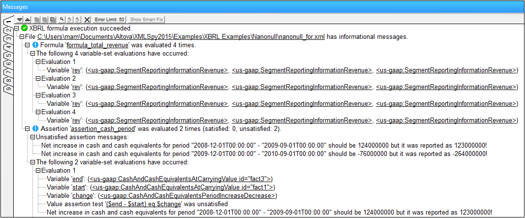 Note : L'exécution d'une trace peut entraîner des dépenses considérables en termes de mémoire et de vitesses de calcul. Lorsque vous utilisez des instances XBRL volumineuses, les assertions peuvent être évaluées des millions de fois et chaque évaluation peut nécessiter de stocker les valeurs de jusqu'à 40 variables. Ainsi, cette fonction doit uniquement être utilisée pour le débogage avec des échantillons petits/réduits, sinon l'exécution sera lente et XMLSpy pourrait manquer de mémoire. C'est pour cela que chaque trace a une limite codée en dur de 1000 évaluations.