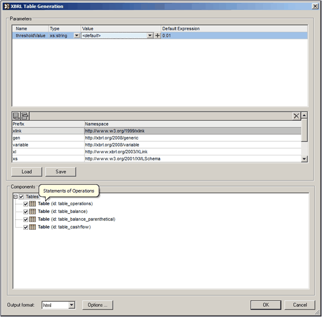 Les commandes Générer Table et Générer Table sur Serveur (haute performance) sont activées lorsqu'(i) un document d'instance XBRL est le document actif dans le Mode Texte ou le Mode Grille ou (ii) une taxonomie XBRL est le document actif dans le Mode XBRL, dans le Mode Texte, le Mode Grille, ou la Mode Schéma. Ces commandes génèrent un document XML ou HTML contenant des tables XBRL définies dans le DTS associé avec le document actif. (un DTS, (Discoverable Taxonomy Set) est une collection de taxonomies.) Dans le cas des fichiers d'instance XBRL, les tables sont générées avec des données dans le fichier d'instance XBRL.