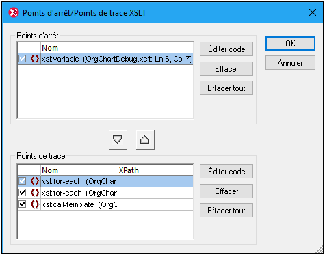 La commande XSL/XQuery | Points d’arrêt/Points de trace ouvre le dialogue Points d'arrêt / Points de trace XSLT. Ceci affiche une liste de tous les points d’arrêt et points de trace actuellement définis (y compris les points d’arrêt et point de trace désactivés) dans tous les fichiers de la session de débogage actuelle.