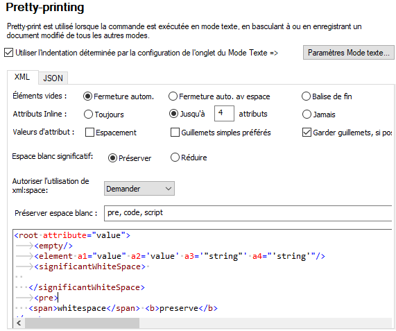 Ces paramètres sont dans la section Pretty-printing du dialogue des Options (voir la capture d’écran ci-dessous). Lorsque vous définissez une option, ses incidences peuvent être vues immédiatement en bas dans le volet de visualisation. Définissez les options de pretty-printing comme bon vous semble. Lorsque vous éditez dans le Mode Texte, vous trouverez éventuellement que la mise en page du document est de moins en moins structurée, en particulier après avoir copié-glissé des blocs de texte. Chaque fois que vous voulez avoir une mise en page propre et hiérarchique, cliquez simplement sur la commande Éditer | Pretty-Printing.