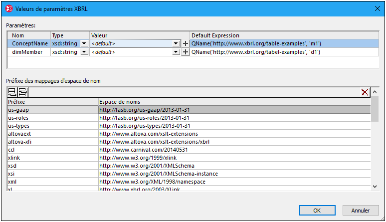 Dans le cas des paramètres qui seront utilisés en tant que paramètres de table, vous pouvez éditer le type de données du paramètre et fournir une valeur de paramètre qui surmonte la valeur par défaut. Pour ce faire, cliquer sur XBRL | Valeurs de paramètres. Ensuite, dans le dialogue qui apparaît (capture d'écran ci-dessous), saisir une valeur de paramètre. Cette valeur surmontera la valeur par défaut. Puisque les paramètres qui sont utilisés en tant que paramètres de table peuvent prendre des valeurs multiples, vous pouvez ajouter des valeurs de paramètre supplémentaires pour un paramètre en cliquant sur l'icône + dans la colonne Valeur.